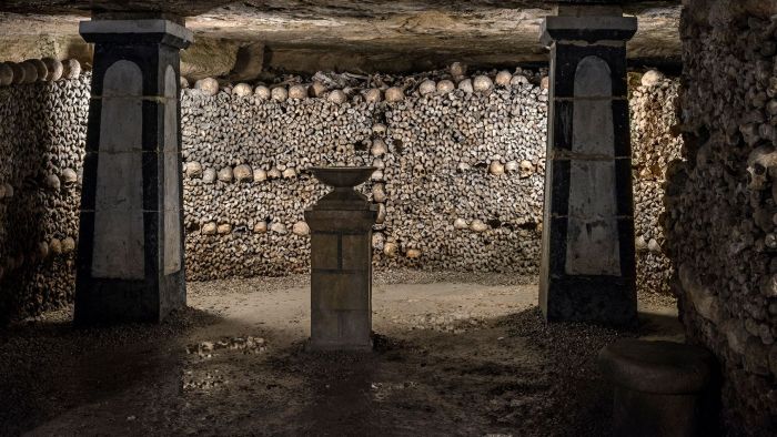 The catacombs of Paris lie 20 metres underground, with 243 steps and 2,000 metres of tunnels. Credit: Paris Musées