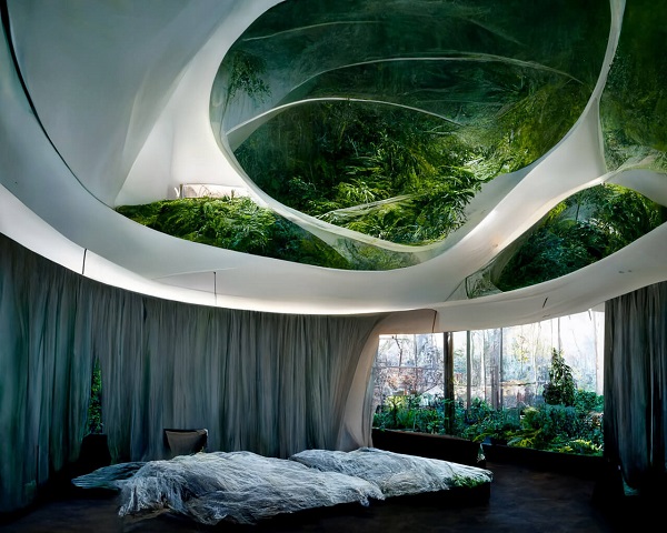 Midjourney can generate, for example, a circular bedroom with a futuristic seaweed ceiling in the style of Zaha Hadid. Credit: William Garner