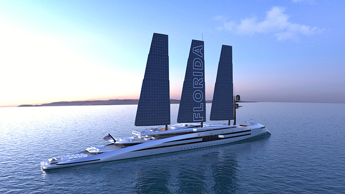 Another remarkable project is the Florida, an ecological superyacht designed by the Norwegian Kurt Strand. Three 80-metre-tall mast-wings crown this 160-metre vessel. Its sails are covered with solar panels that automatically move to capture the Sun's rays. In this way, when there is no wind, the boat can activate a solar sailing mode. The masts are fitted with a washing system to keep the solar panels clean and working properly.