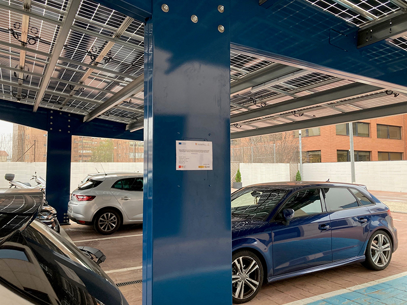 Los módulos están ubicados en el parking exterior de la fachada principal del edificio, en las oficinas centrales de Sacyr en Condesa de Venadito, 7 donde dan sombra a los coches al tiempo que los módulos bifaciales permiten el paso de luz hacia las plazas que disponen de marquesina.